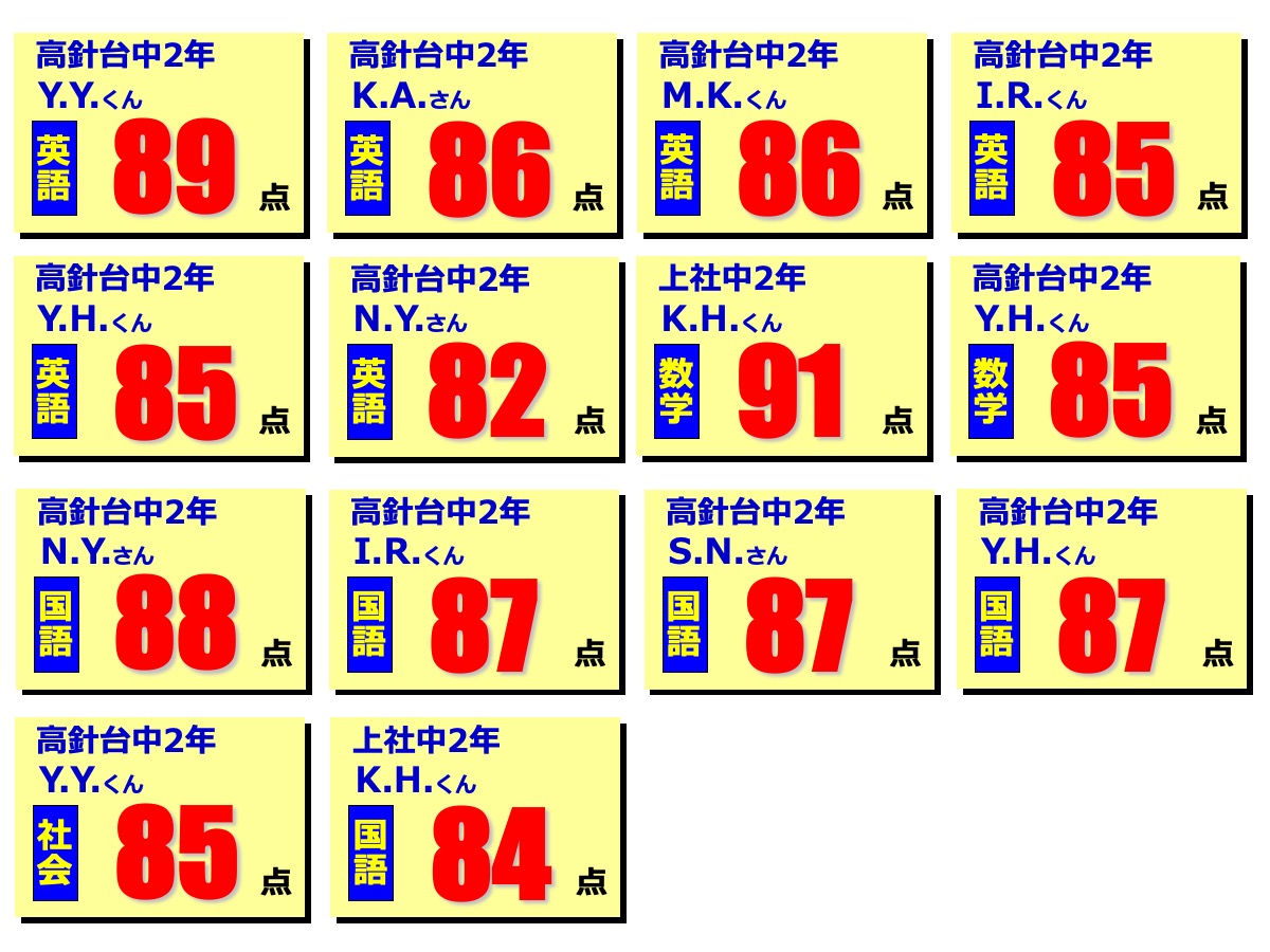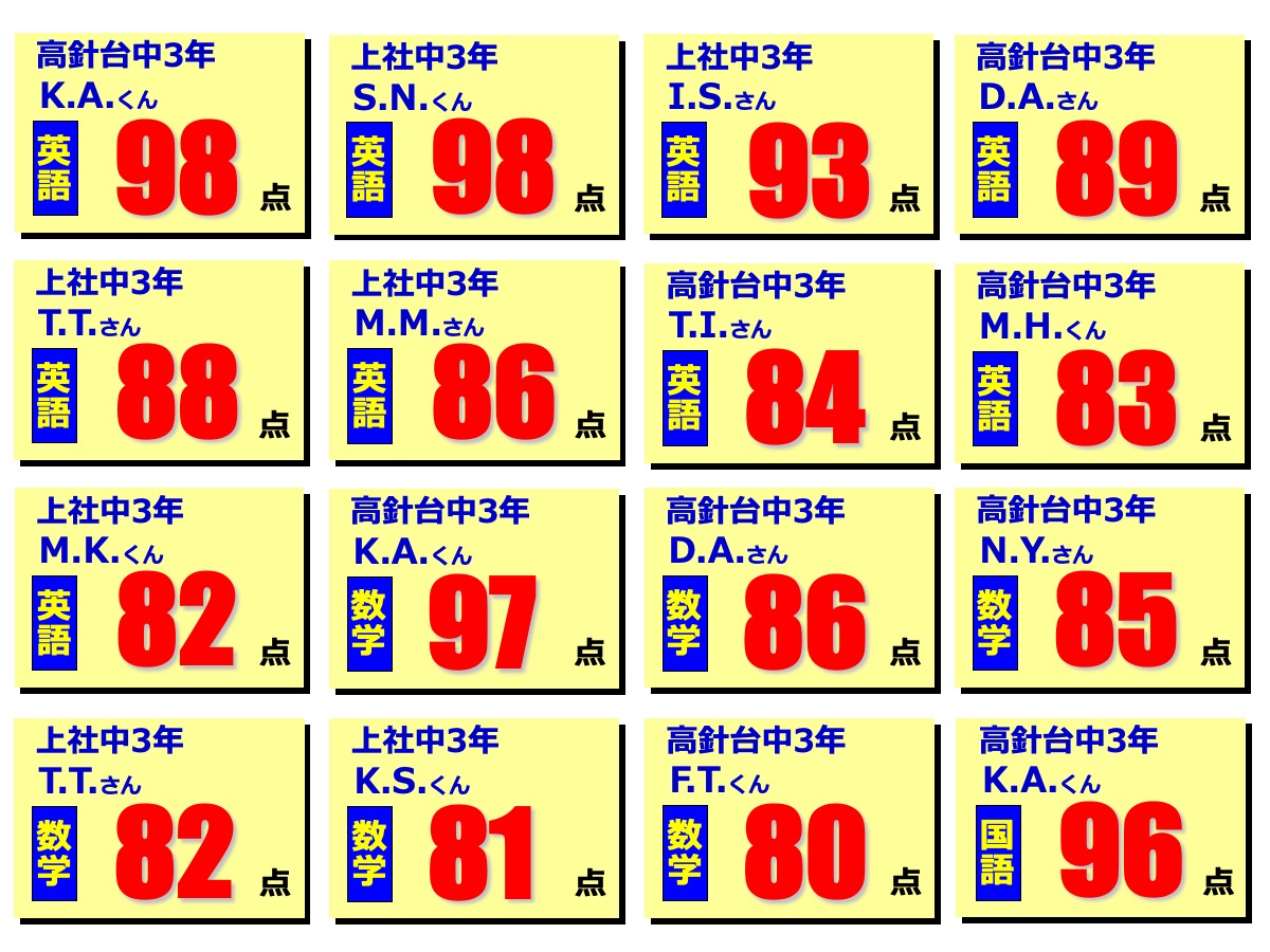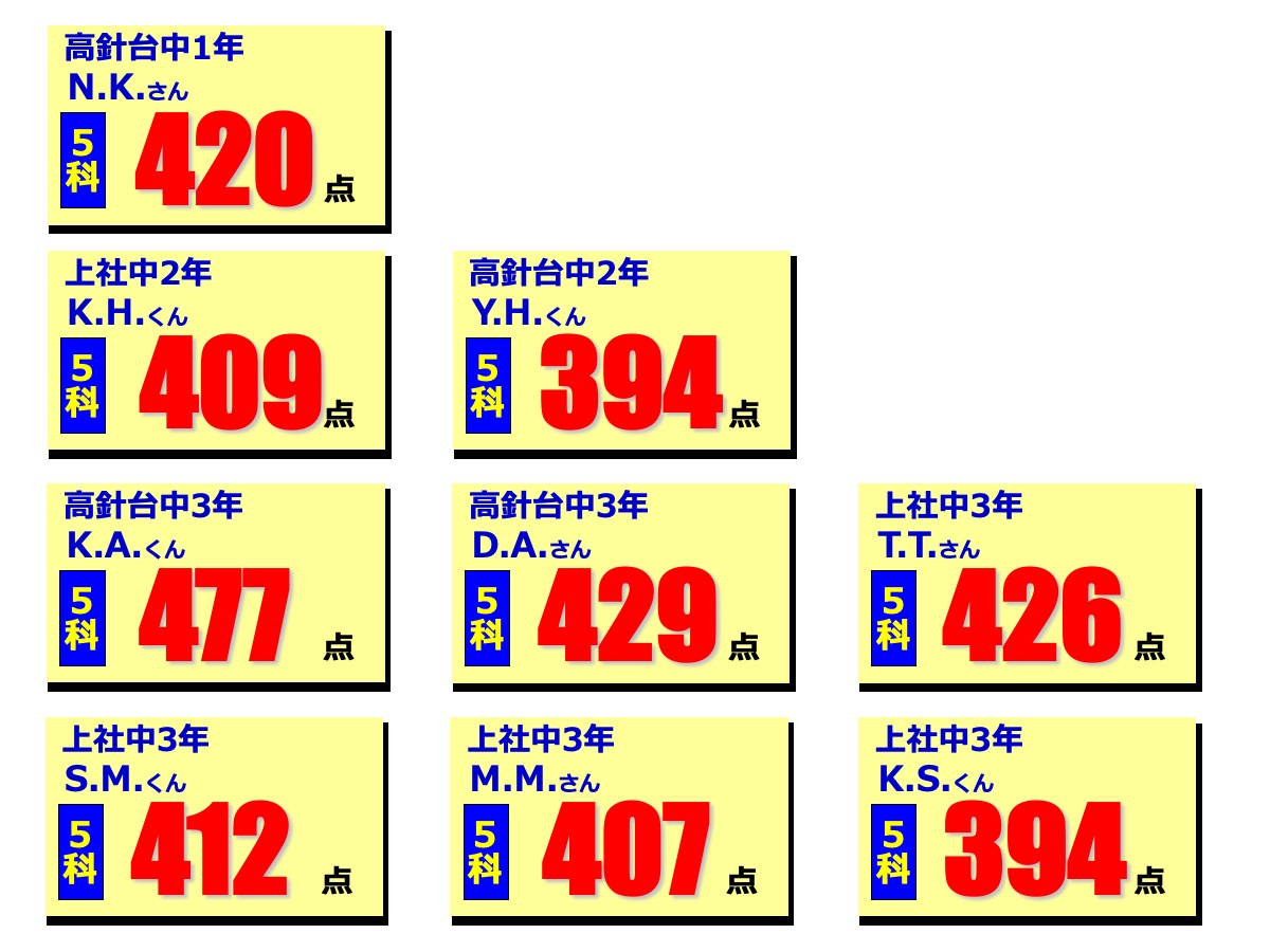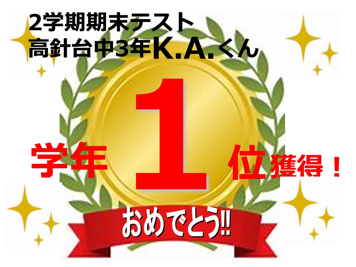 昂学館結果発表:2学期期末テスト2025.12.12令和7年度(2025年度)2学期期末テストで、高針台中学校、上社中学校の生徒が好成績を収めました!高針台中3年K.A.くんは、学年順位1位獲得!学年順位1桁の生徒5教科合計390点以上の生徒各教科80点以上の生徒前回より得点が2桁アップした生徒中学生 学年順位※1桁の生徒のみ掲載中学生 5教科合計390点以上の生徒 ※該当生徒のみ掲載 中学生 各教科80点以上の生徒 ※該当生徒のみ掲載中学生 前回より得点が2桁アップした生徒 ※該当生徒のみ掲載 【昂学館】12月23日より冬期講習が始まります。前の記事 昂学館 通信:2026年1月号次の記事