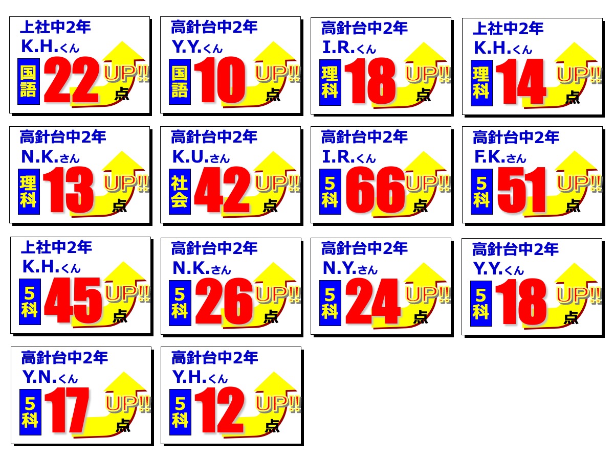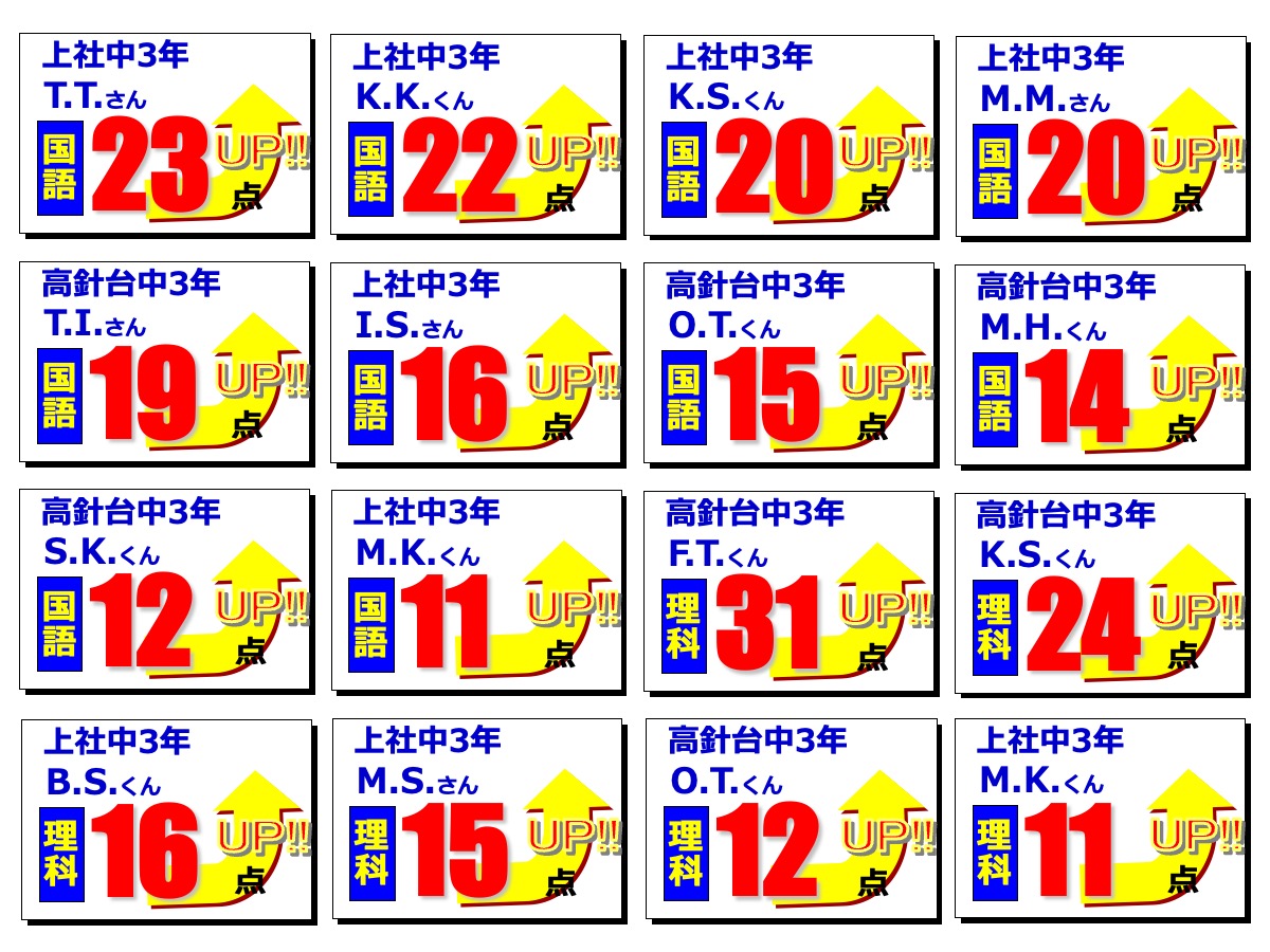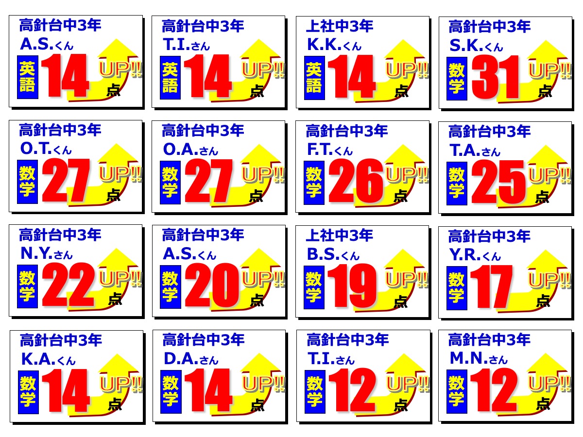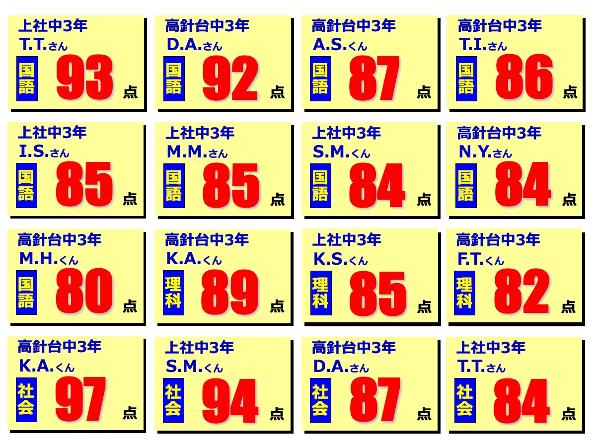 昂学館結果発表:2学期期末テスト2025.12.12令和7年度(2025年度)2学期期末テストで、高針台中学校、上社中学校の生徒が好成績を収めました!高針台中3年K.A.くんは、学年順位1位獲得!学年順位1桁の生徒5教科合計390点以上の生徒各教科80点以上の生徒前回より得点が2桁アップした生徒中学生 学年順位※1桁の生徒のみ掲載中学生 5教科合計390点以上の生徒 ※該当生徒のみ掲載 中学生 各教科80点以上の生徒 ※該当生徒のみ掲載中学生 前回より得点が2桁アップした生徒 ※該当生徒のみ掲載 【昂学館】12月23日より冬期講習が始まります。前の記事 昂学館 通信:2026年1月号次の記事