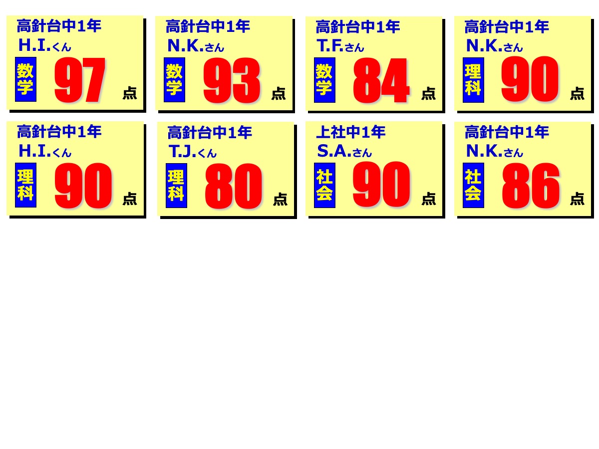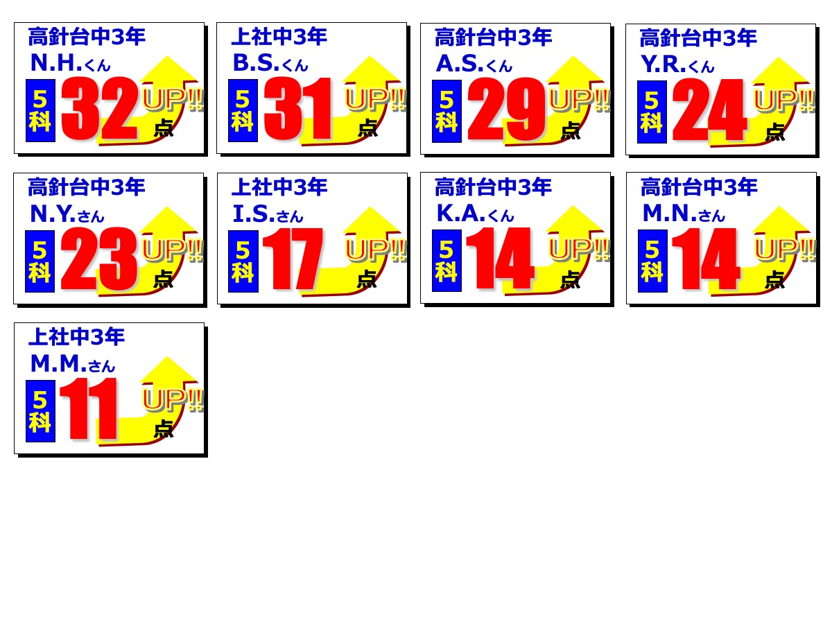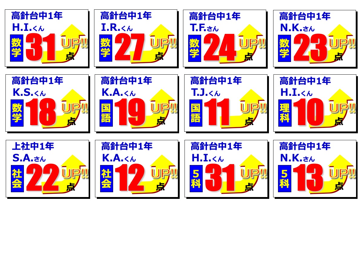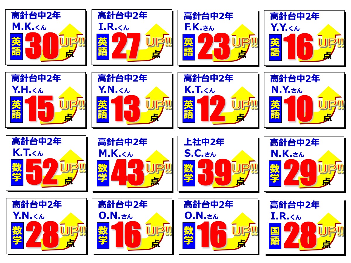昂学館結果発表:2学期期末テスト2025.12.12令和7年度(2025年度)2学期期末テストで、高針台中学校、上社中学校の生徒が好成績を収めました!高針台中3年K.A.くんは、学年順位1位獲得!学年順位1桁の生徒5教科合計390点以上の生徒各教科80点以上の生徒前回より得点が2桁アップした生徒中学生 学年順位※1桁の生徒のみ掲載中学生 5教科合計390点以上の生徒 ※該当生徒のみ掲載 中学生 各教科80点以上の生徒 ※該当生徒のみ掲載中学生 前回より得点が2桁アップした生徒 ※該当生徒のみ掲載 【昂学館】12月23日より冬期講習が始まります。前の記事 昂学館 通信:2026年1月号次の記事